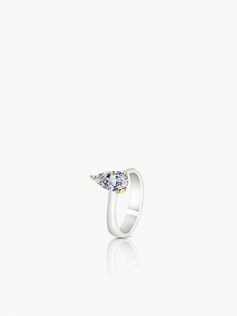 The Eleanor Engagement Ring features a pear cut natural diamond and a half round, tapered band. Like her namesake Eleanor of Aquitaine, this bold and brilliant style stands the test of time making The Eleanor our most prized design.