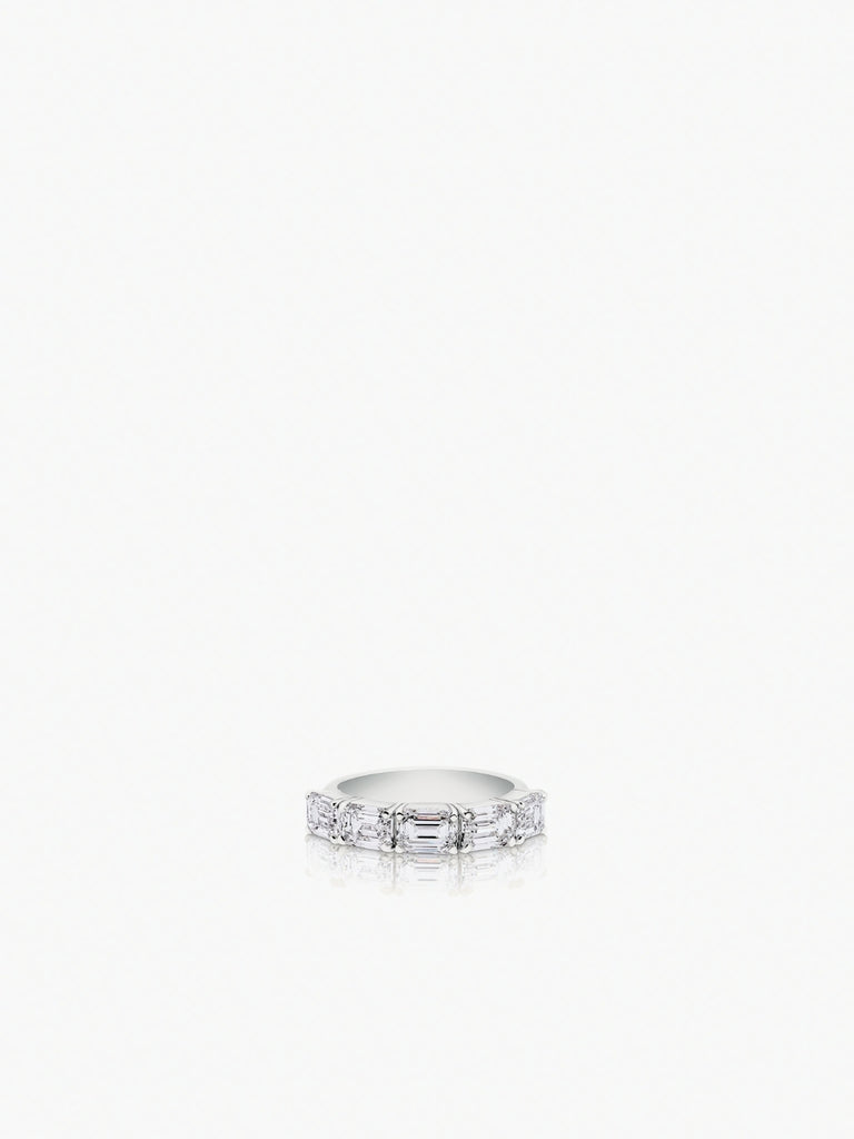 The BIG LOVE DIAMOND BAND features 5 emerald cut natural diamonds and crafted in either 18 Carat Yellow or White Gold or Platinum. The Big Love Diamond Band is a 1/2 eternity band and stacks beautifully or worn as a statement piece for a sleek look.