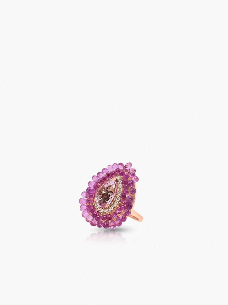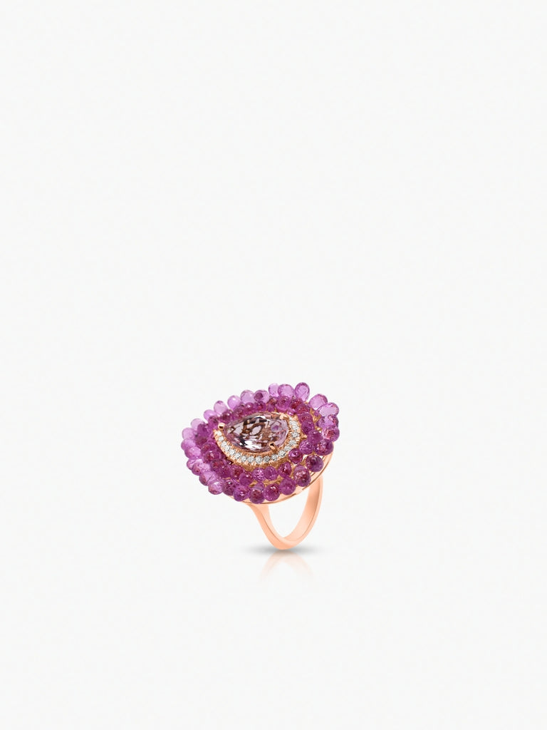 Briolette cut gemstones symbolise the commitment between two people. This delightful cocktail ring featuring a morganite centre surrounded by 26 dazzling diamonds and delicate briolette cut pink sapphires is the ultimate cocktail ring. Crafted in 18 Karat Rose Gold.
